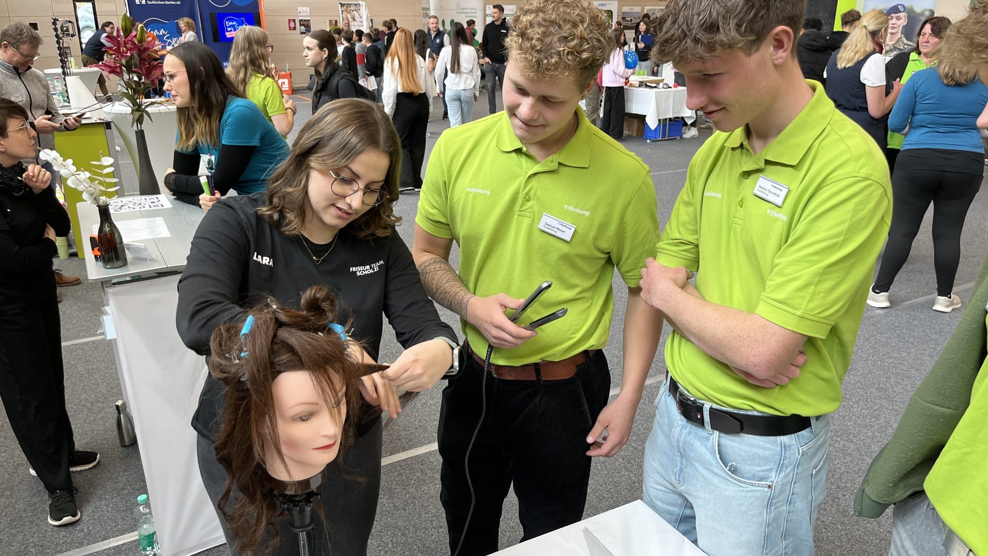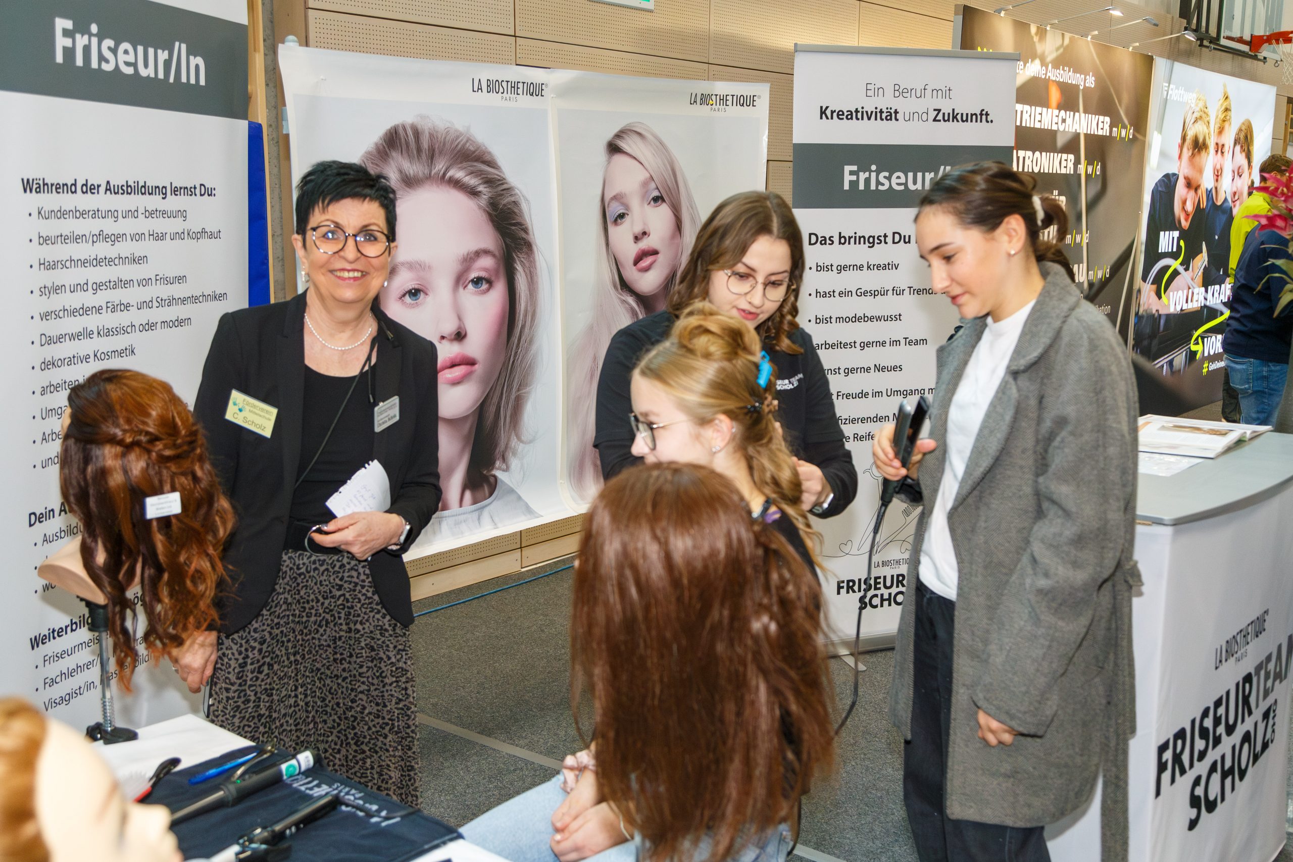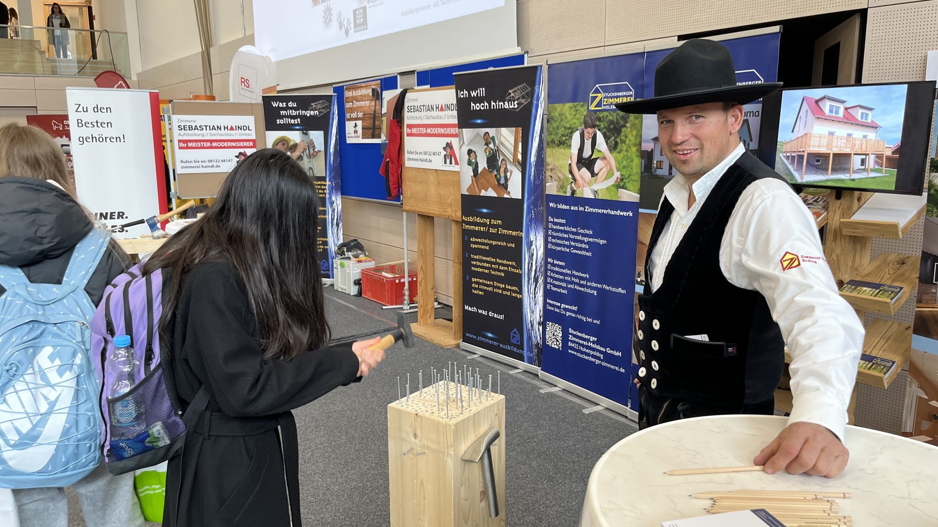 Die Schülerinnen und Schüler unserer und weiterer Mittelschulen aus Wartenberg, Velden, Isen, Landshut Nikola, Oberding, Erding Lodererplatz, Forstern sowie der Realschule Taufkirchen/Vils konnten direkt mit den Ausbildern ins Gespräch kommen, Fragen stellen, Informationen einholen und bei einigen sogar kleine praktische Aufgaben ausprobieren: Haare frisieren, Holz schneiden, Nägel schlagen oder ihr Feingefühl am „heißen Draht“ testen.