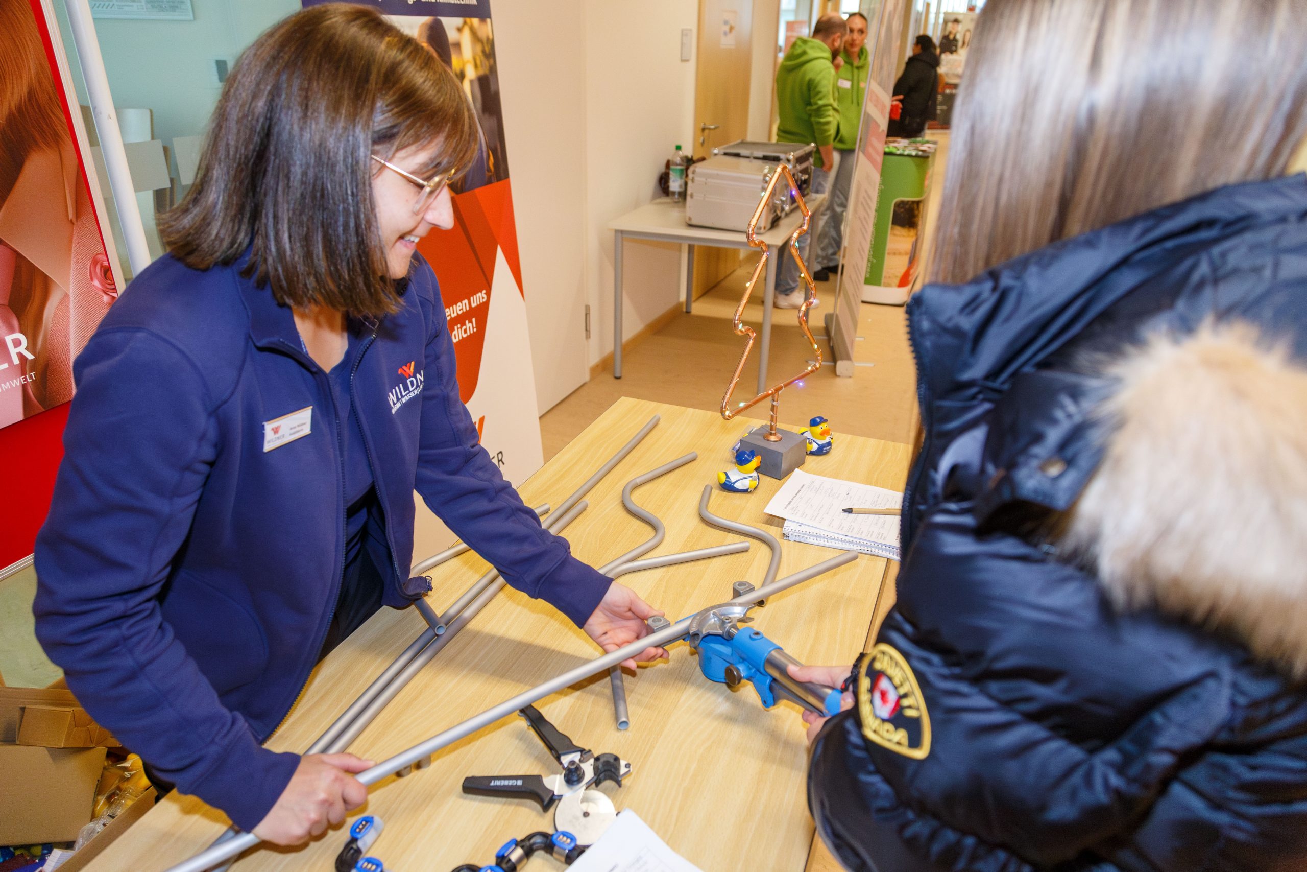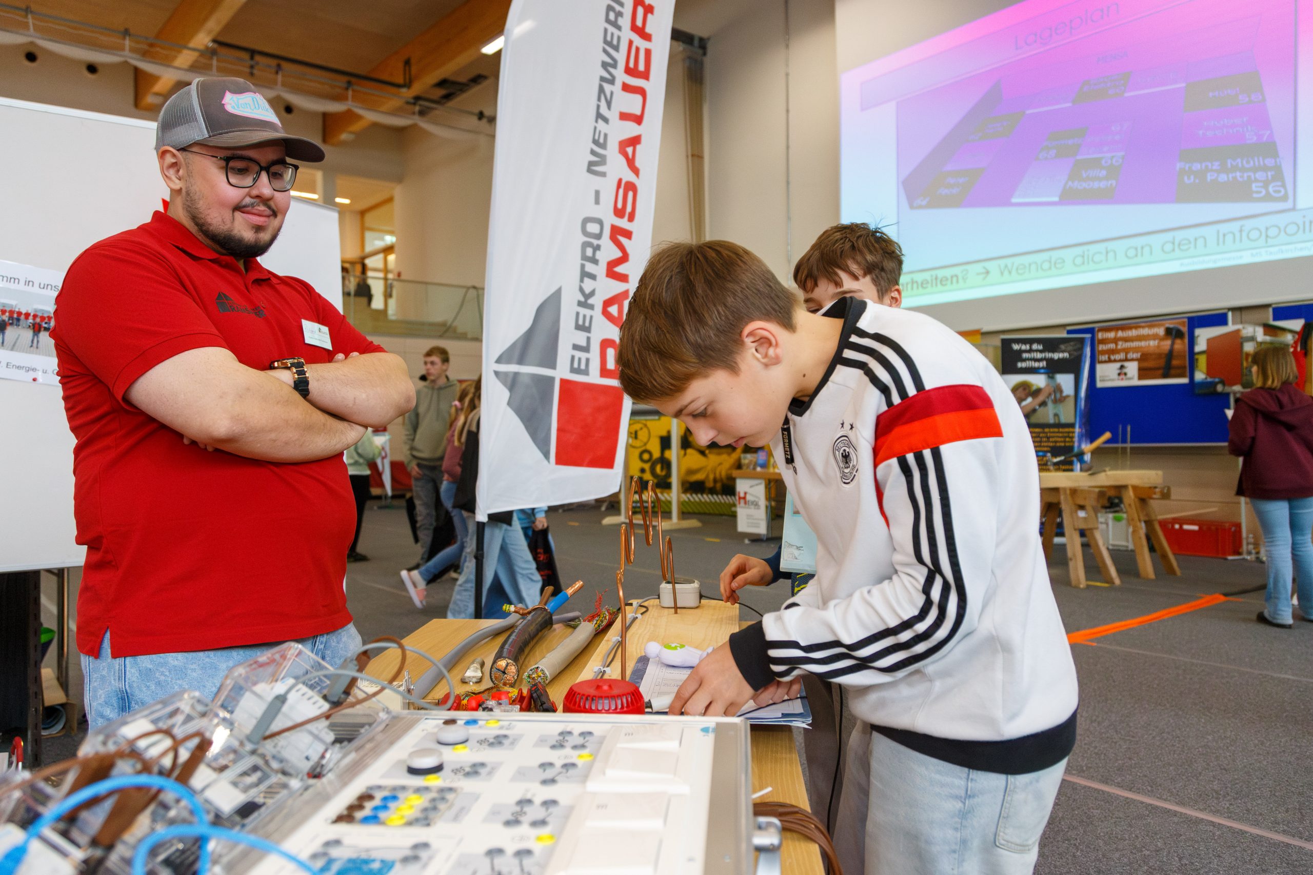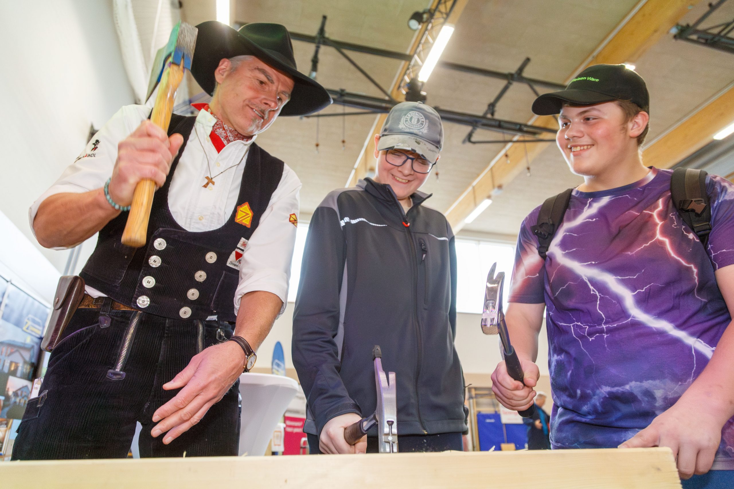 Die Schülerinnen und Schüler unserer und weiterer Mittelschulen aus Wartenberg, Velden, Isen, Landshut Nikola, Oberding, Erding Lodererplatz, Forstern sowie der Realschule Taufkirchen/Vils konnten direkt mit den Ausbildern ins Gespräch kommen, Fragen stellen, Informationen einholen und bei einigen sogar kleine praktische Aufgaben ausprobieren: Haare frisieren, Holz schneiden, Nägel schlagen oder ihr Feingefühl am „heißen Draht“ testen.