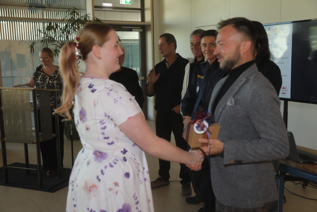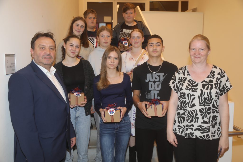 Erstmalig organisierte Frau Leber in diesem Schuljahr auch eine besondere Schülerehrung. Die OWachtler, die bereits seit längerer Zeit ihren Dienst zuverlässig verrichten, bekamen vom 1. Bürgermeister der Gemeinde Taufkirchen, Herrn Haberl, eine schöne Gemeindetasse und einen Taufkirchner Zehner.