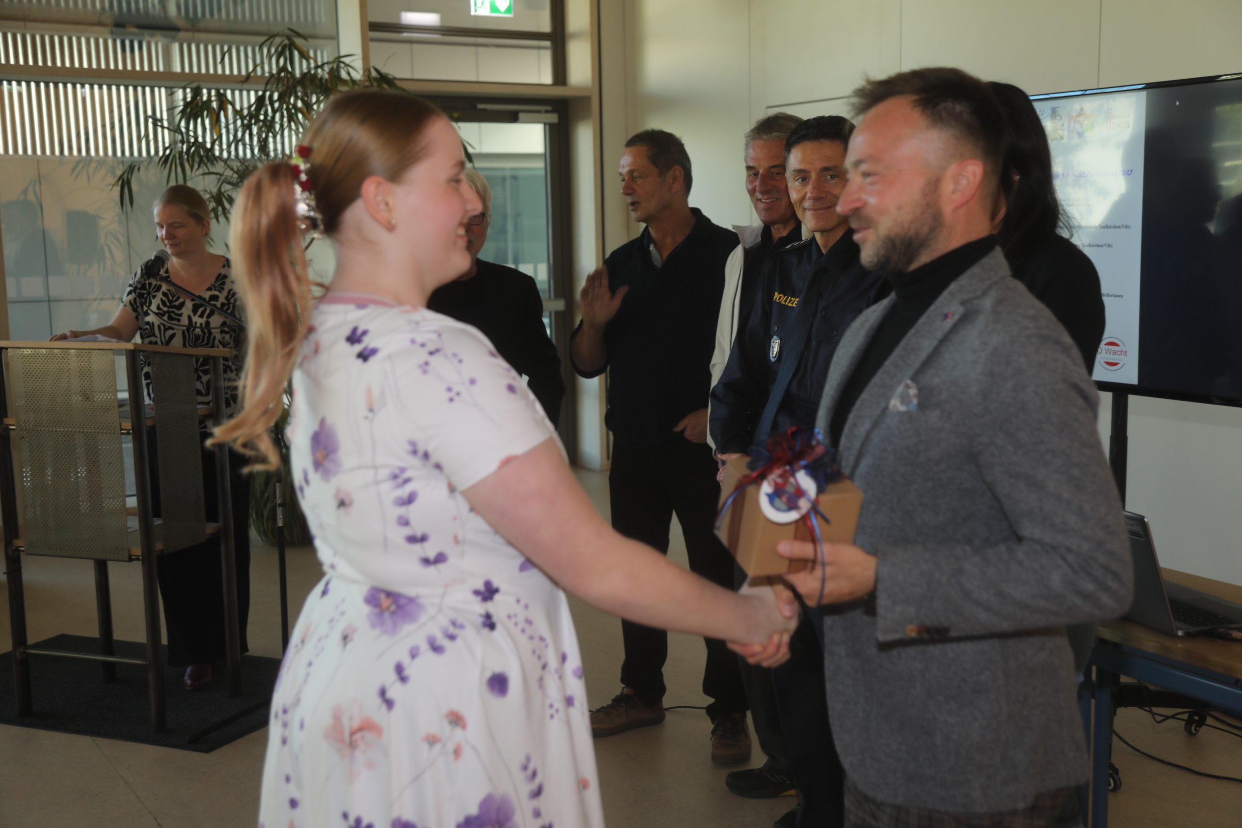 Erstmalig organisierte Frau Leber in diesem Schuljahr auch eine besondere Schülerehrung. Die OWachtler, die bereits seit längerer Zeit ihren Dienst zuverlässig verrichten, bekamen vom 1. Bürgermeister der Gemeinde Taufkirchen, Herrn Haberl, eine schöne Gemeindetasse und einen Taufkirchner Zehner.