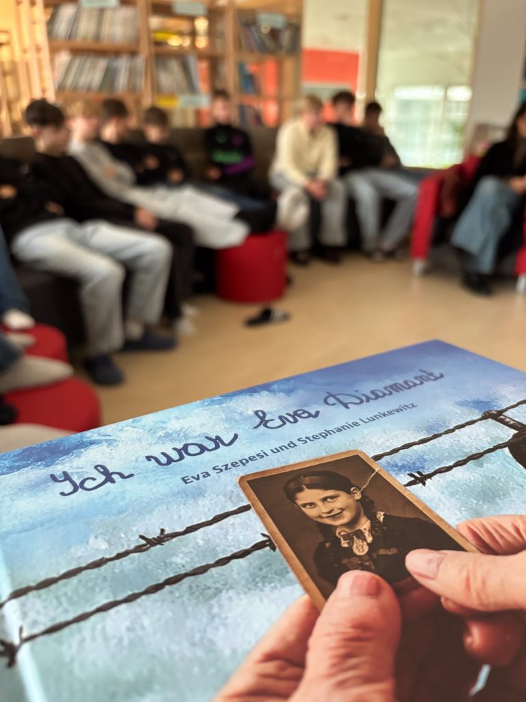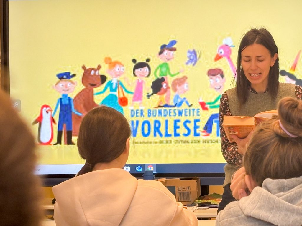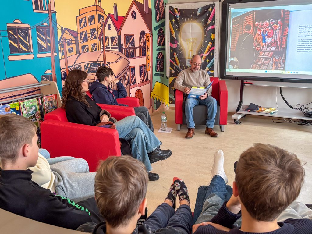 Dieses Mal bedanken wir uns beim Mittelschulseminar nicht nur für`s Vorlesen in vielen Klassen, sondern auch für Buchspenden der Seminarleiterin Anna Heindl. Unser Dank geht ebenso an Yvonne Wiesmann, Alona Shramko und Ade Geier, der in der Nikolausklasse las. Da die Lesung von Stephanie Lunkewitz Anfang Oktober die 6. Klassen nachhaltig bewegte, las Robert Ackermann in der neuen Schülerbücherei für mehrere Klassen „Ich war Eva Diamant“ gegen das Vergessen, für Menschlichkeit!